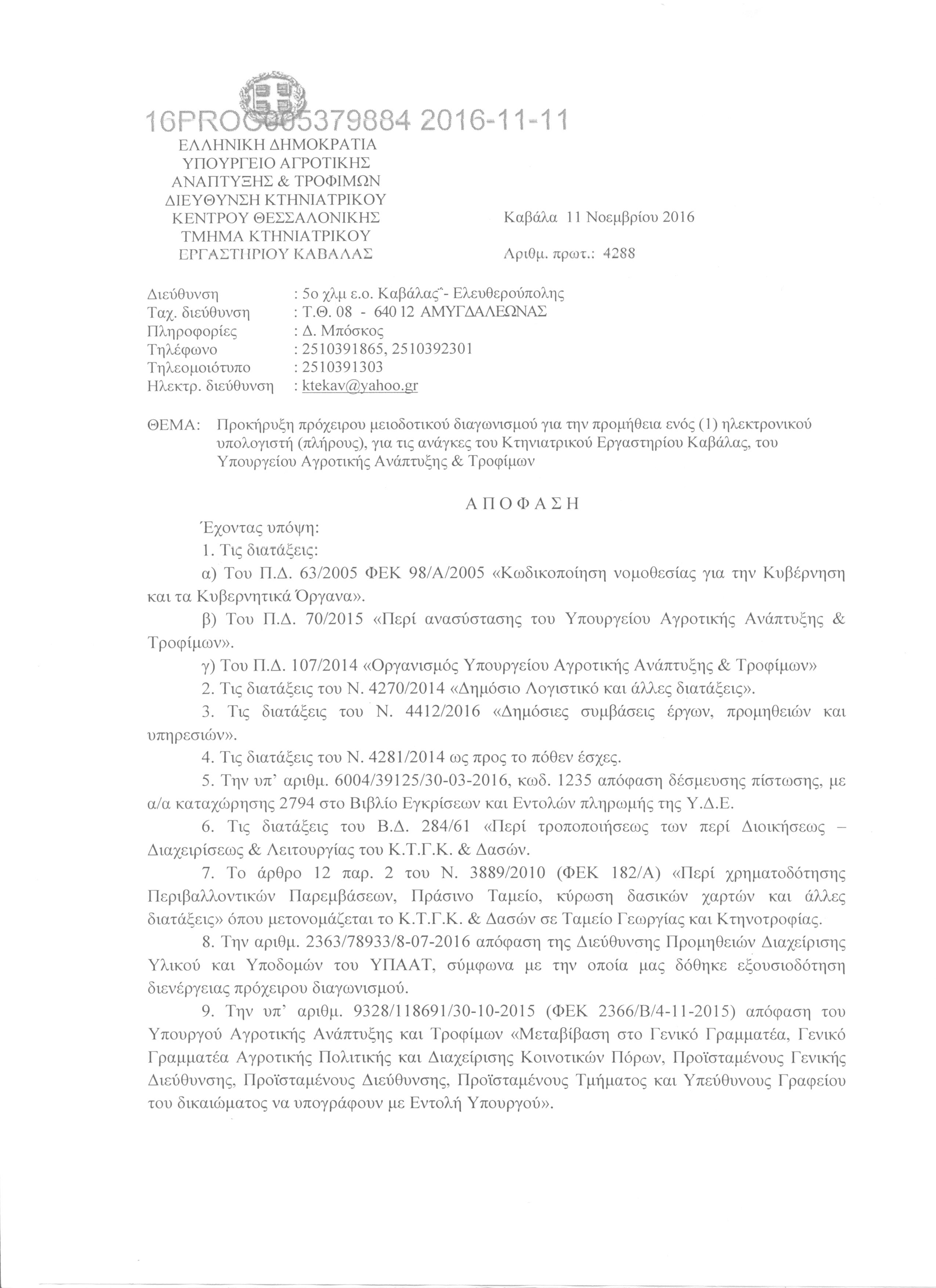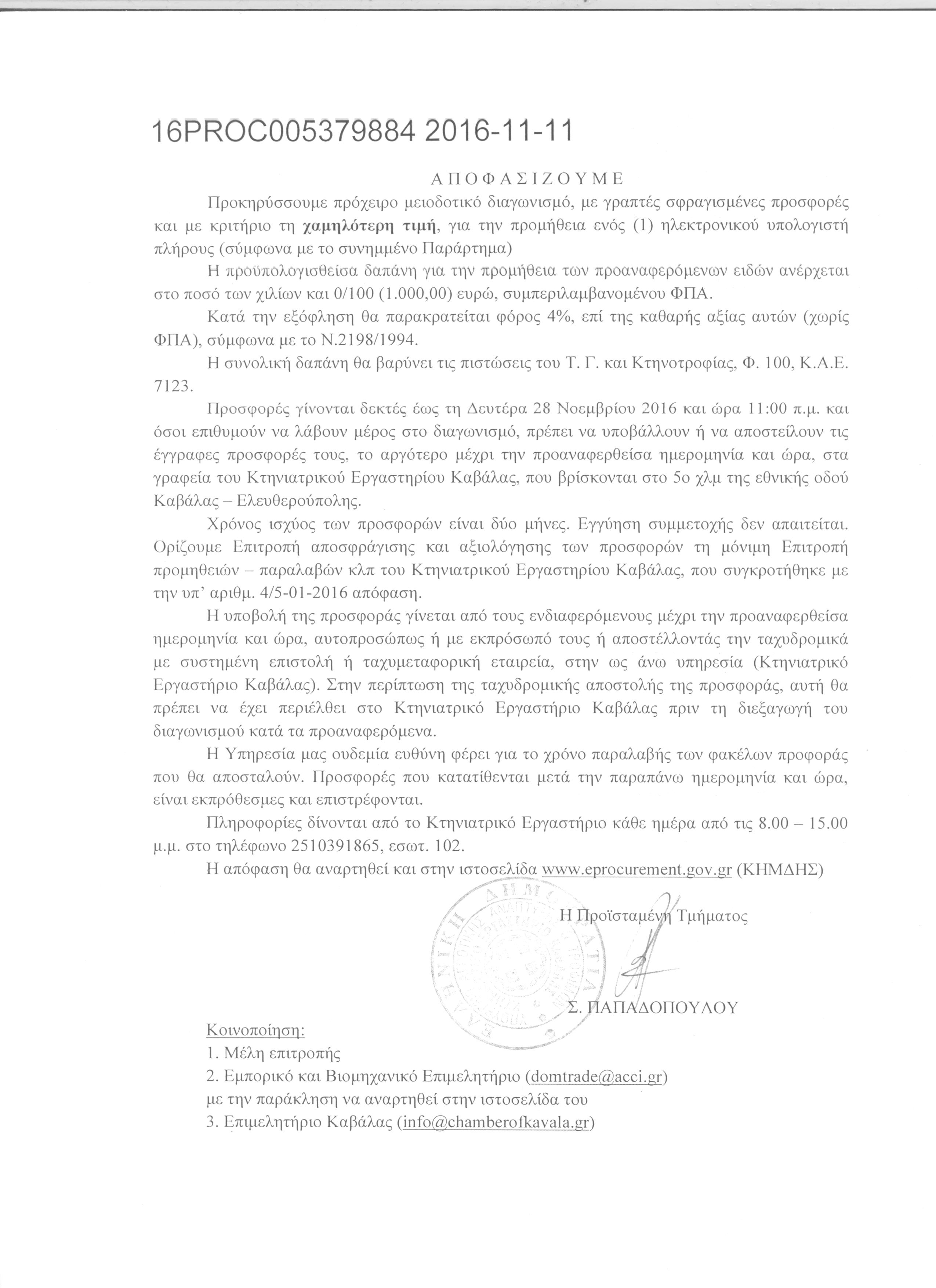 Προκήρυξη διενέργειας πρόχειρου διαγωνισμού Κτηνιατρικού Εργαστηρίου Καβάλας για την προμήθεια Η/Υ