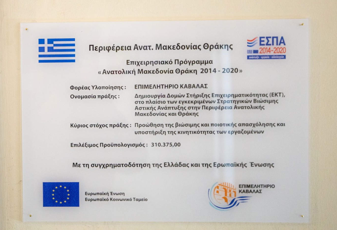 Το έργο συνολικού προϋπολογισμού 310.375,00€ χρηματοδοτείται στο πλαίσιο του προγράμματος Στρατηγικών Βιώσιμης Αστικής Ανάπτυξης στην Περιφέρεια Ανατολικής Μακεδονίας και Θράκης από το Ευρωπαϊκό Κοινωνικό Ταμείο.