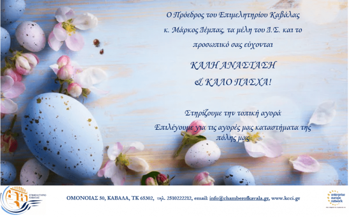 Ο Πρόεδρος του Επιμελητηρίου Καβάλας κ. Μάρκος Δέμπας, τα μέλη του Δ.Σ. και το προσωπικό σας εύχονται ΚΑΛΗ ΑΝΑΣΤΑΣΗ & ΚΑΛΟ ΠΑΣΧΑ!