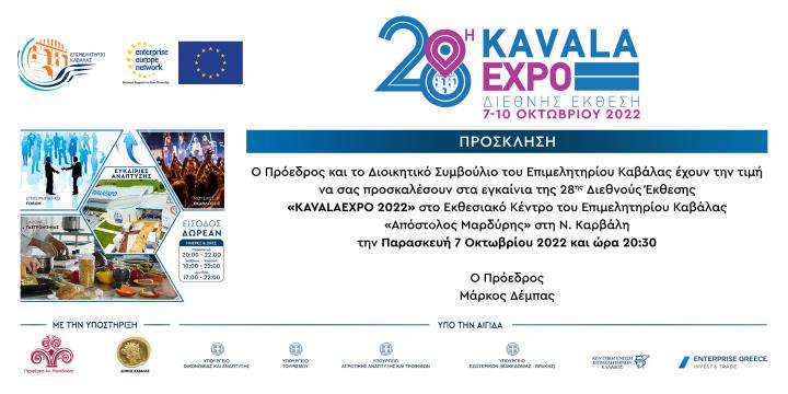 Ο Πρόεδρος και το Διοικητικό Συμβούλιο του Επιμελητηρίου Καβάλας έχουν την τιμή να σας προσκαλέσουν στα εγκαίνια της 28ης Διεθνούς Έκθεσης «KAVALAEXPO2022» στο Εκθεσιακό Κέντρο του Επιμελητηρίου Καβάλας «Απόστολος Μαρδύρης» στη Ν.Καρβάλη, την Παρασκευή 7 Οκτωβρίου 2022 και ώρα 20:30.