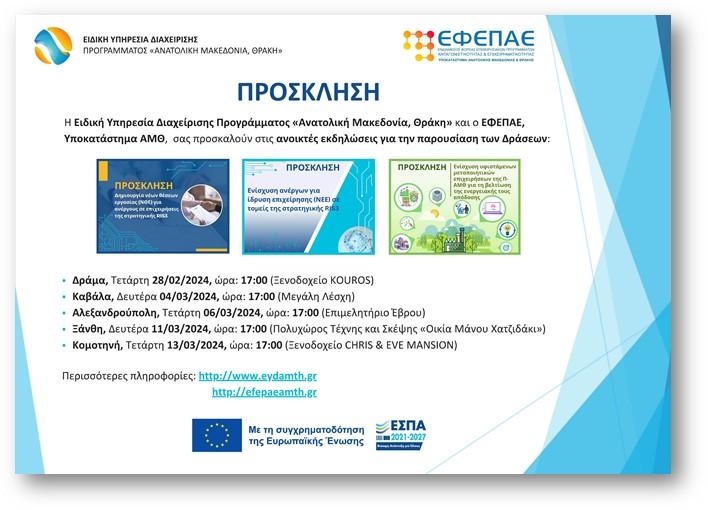 Πρόσκληση σε Ενημερωτικές Εκδηλώσεις δράσεων επιχειρηματικότητας