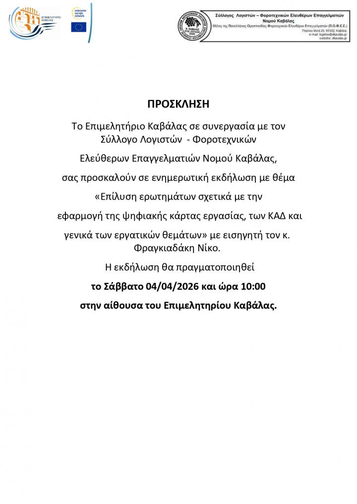 Πρόσκληση σε ενημερωτική εκδήλωση του Συλλόγου Λογιστών - Φοροτεχνικών Ελεύθερων Επαγγελματιών Νομού Καβάλας
