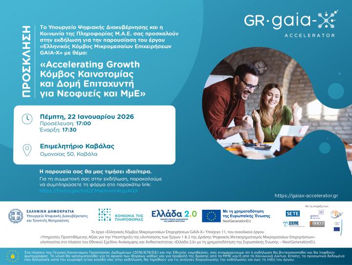 Tο Υπουργείο Ψηφιακής Διακυβέρνησης και η Κοινωνία της Πληροφορίας Μ.Α.Ε. διοργανώνουν ενημερωτική Ημερίδα παρουσίασης του έργου «Ελληνικός Κόμβος Μικρομεσαίων Επιχειρήσεων GAIA-X».