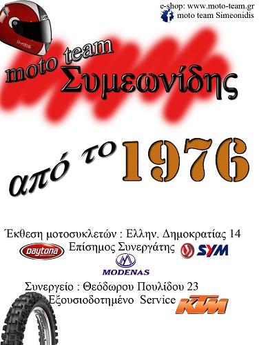 Η επιχείρηση "ΜΟΤΟ ΤΕΑΜ ΣΥΜΕΩΝΙΔΗΣ" ξεκίνησε να δραστηριοποιείται στο χώρο της μοτοσυκλέτας από το 1976 και στην εμπορία αξεσουάρ μοτοσικλετιστών. Η ομάδα του moto Συμεωνίδης είναι προσανατολισμένη στην καρδία της μοτοσυκλέτας. Δημιουργός της επιχείρησης ήταν ο Βασίλειος Συμεωνίδης και πλέον αποτελείται από την ομάδα υπεύθυνοι πωλήσεων (Ελένη Συμεωνίδου και Θεόδωρος Τόλιος), υπεύθυνος συνεργείου (Άγγελος Συμεωνίδης). Σήμερα η επιχείρηση διαθέτει στην ελληνική αγορά, προϊόντα επώνυμων εταιρειών που έχουν κερδίσει την εμπιστοσύνη του κοινού της. Είναι επίσημος συνεργάτης των εταιρειών SYM, MODENAS, DAYTONA, KTM σε πωλήσεις και service.
